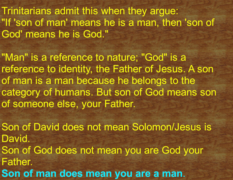 The son of God means son of God the Father, the Son is not his father and the father is not his son. You see the first problem with this argument. Let's just take their argument and use it like they use it, if son of man means Jesus is God then 'son of Mary' means Jesus is Mary. Their arguments is pretty silly but whatever sounds good to their ears is quite often what you run with in trinitarianism. The word man is a reference to nature, you know it's not a reference to a particular identity. The word God and the term son of God is a reference to a particular identity, God the Father the father of Jesus. Son of man is a man because he belongs to the category of humans but son of God means son of someone else your father God, and as we just illustrated Christians are begotten sons of God or daughters of God.